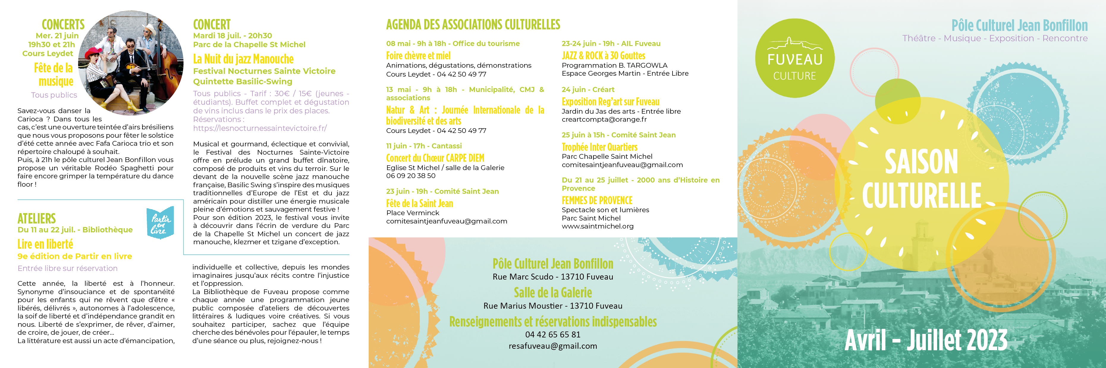 Depuis plusieurs mois, j’accompagne la mairie de Fuveau pour la création de différents supports de communication : affiches publicitaires mensuelles, plaquette culturelle trimestrielle, carte de voeux …