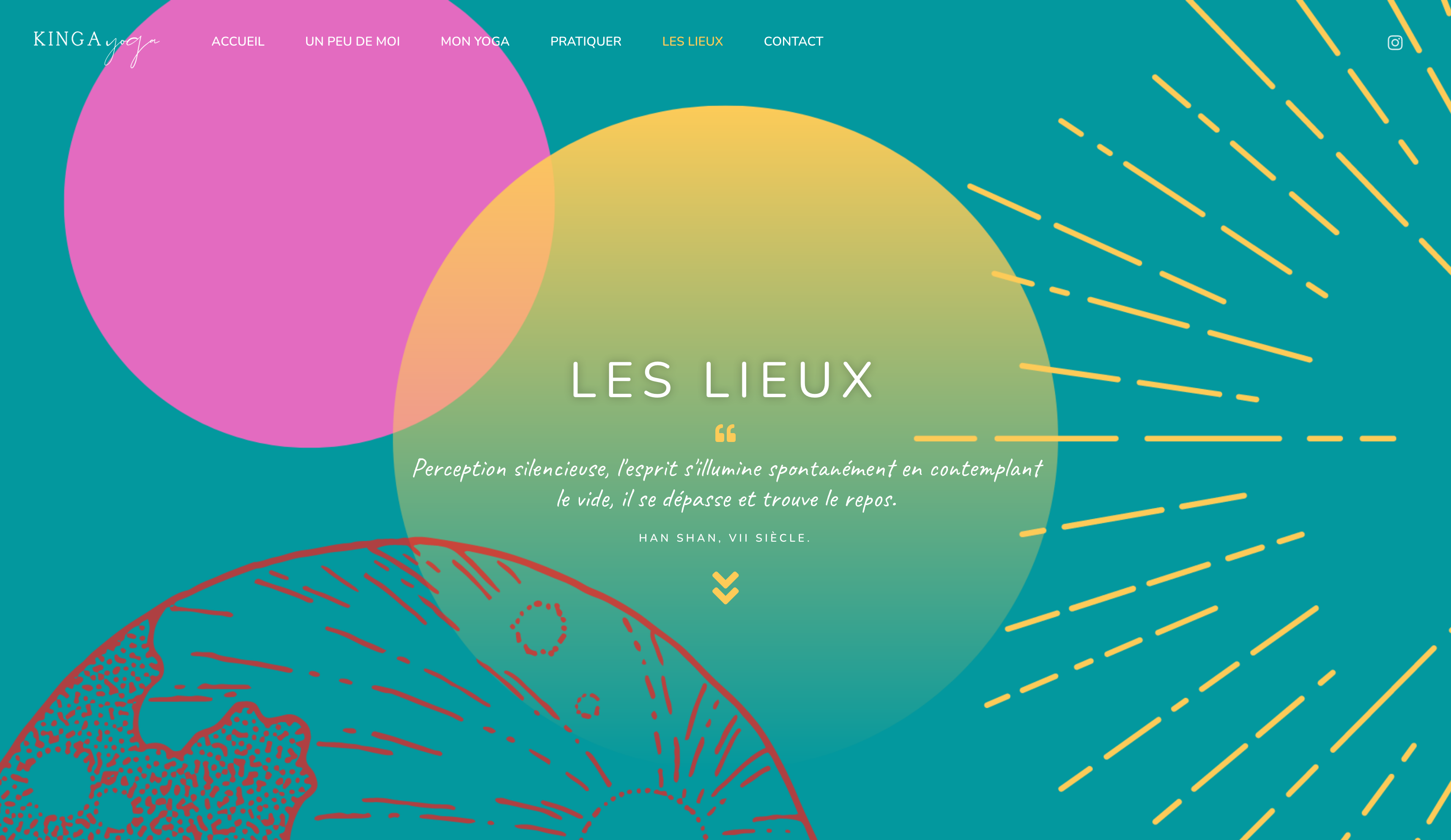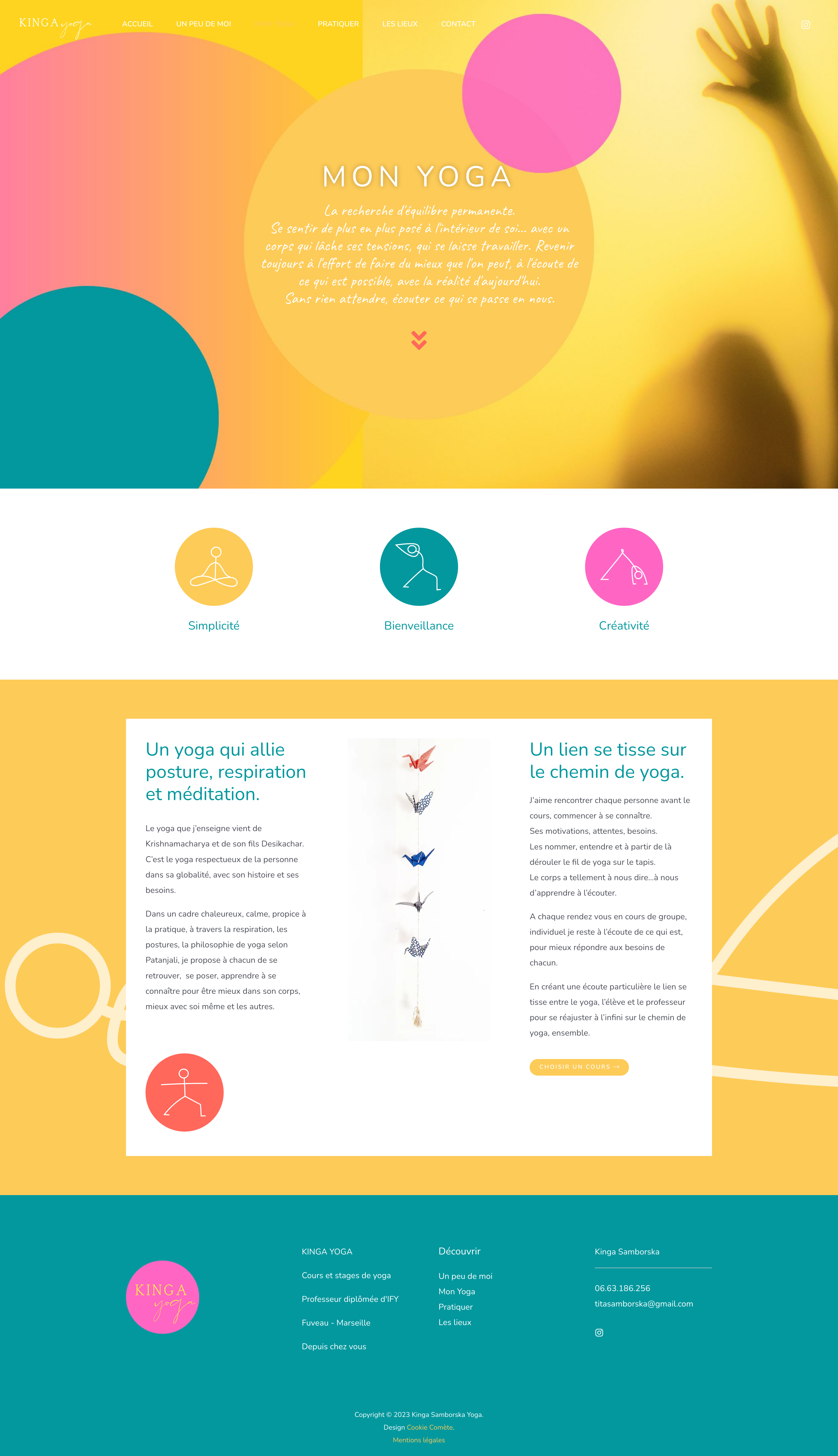 Pour son site internet, Kinga, professeur de yoga, souhaitait faire apparaitre sa vision artistique du yoga. J’ai travaillé sur des couleurs vives, des graphismes stellaires, tout en gardant une mise en page aérée et agréable à parcourir. J’ai également créé des icônes uniques, en retravaillant les propres dessins de Kinga dans ses carnets de yoga.